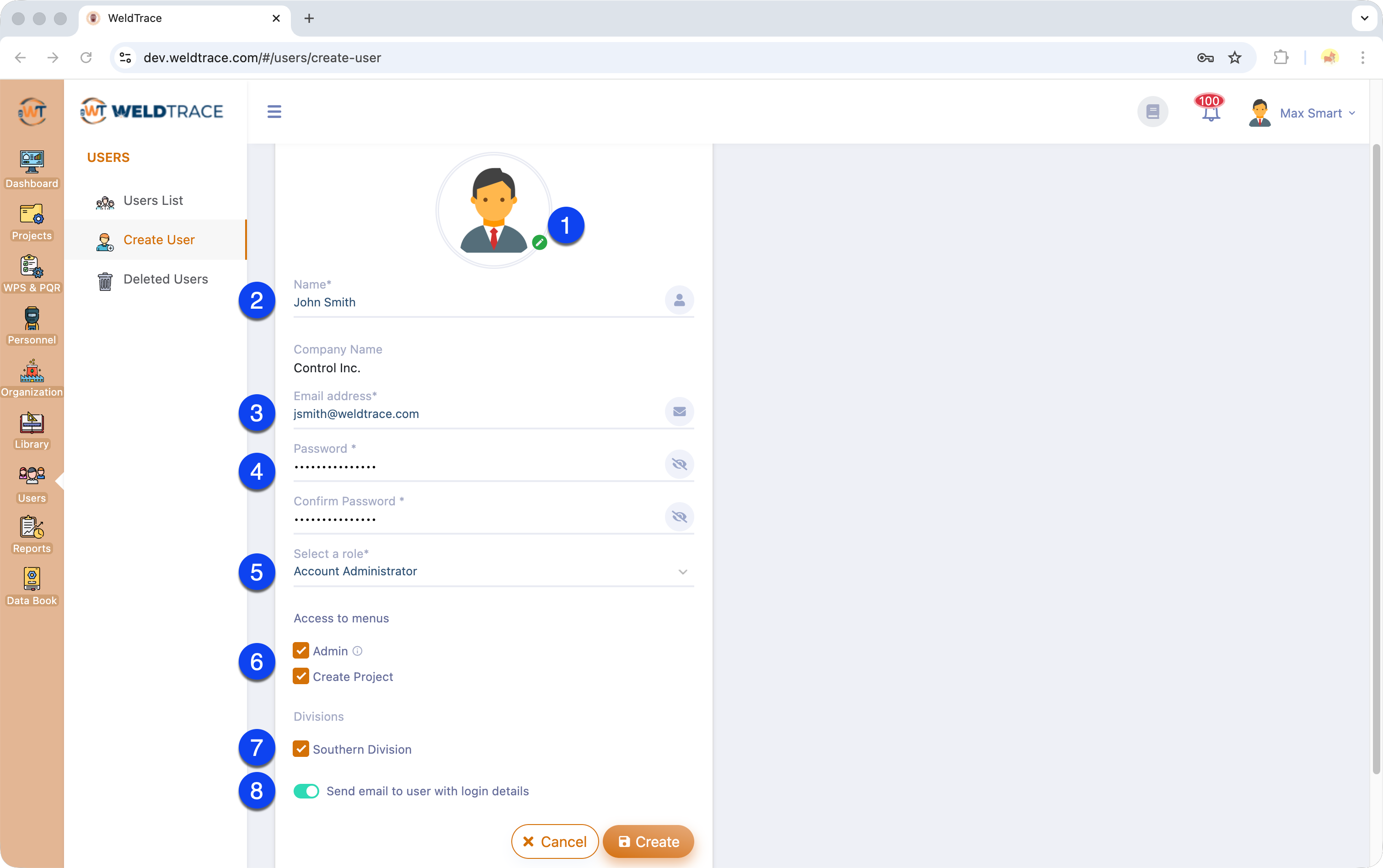 There can be only one Super User per account. Account administrators with Super User privileges cannot edit the Super User. Contact WeldTrace Support if the Super User should be changed and the role allocated to another user